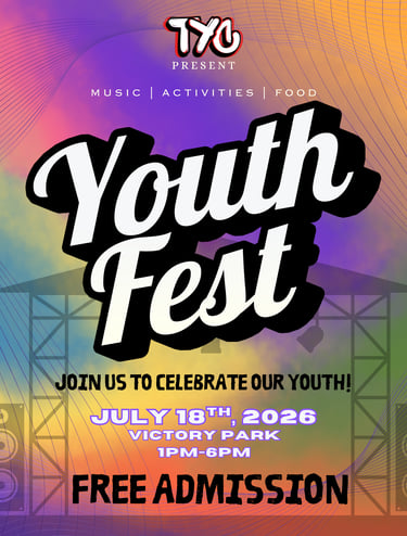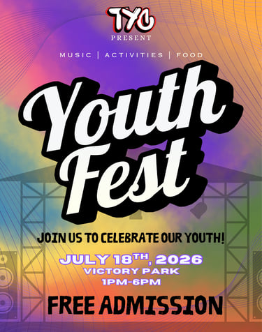 From 1pm-6pm on July 18th, 2026 we are hosting our Youth Fest and we would LOVE to see you there. Come on down to Victory Park where there will be music, food trucks, and some SUPER DUPER FUN ACTIVITIES!